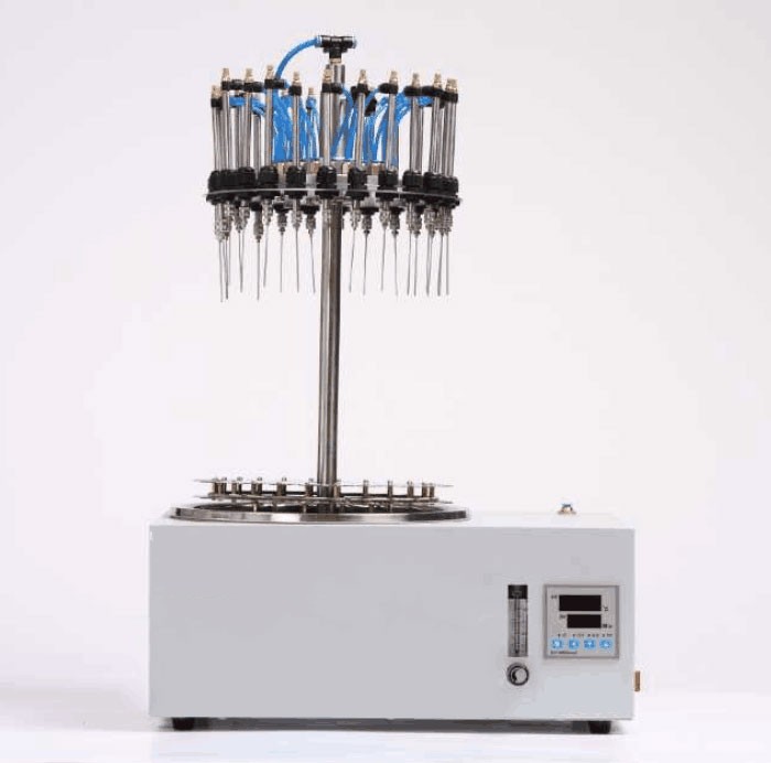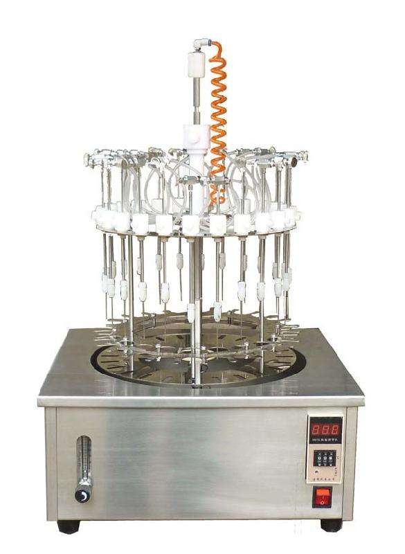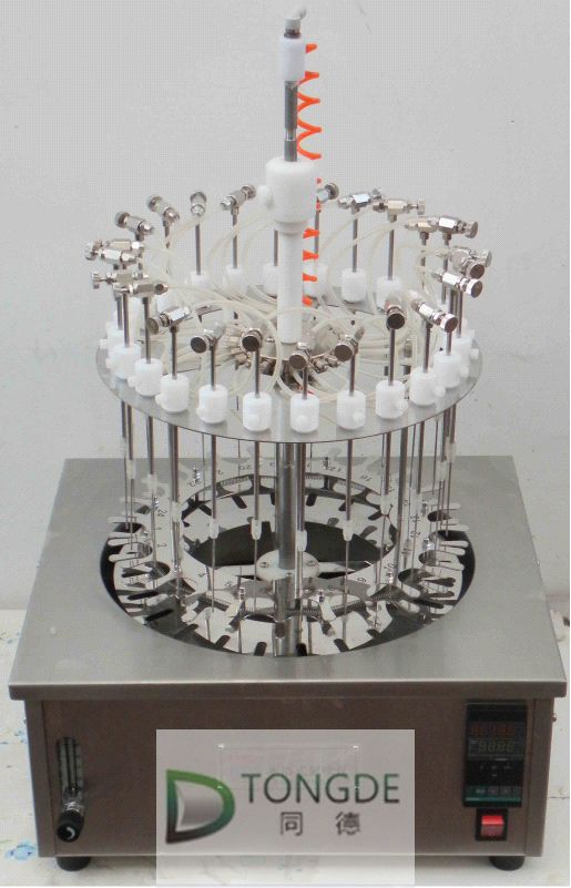 本儀器包括底座和支架裝置、樣品架和氣體分配系統。試管通過帶彈簧的試管夾和支撐盤來固定位置。每個樣品位都有數字編號;氣體通過流量計到達氣體分配系統,靈活的引導管將氣體導入每個位置的閥和不銹鋼針,將氣體吹至樣品表面,從而使溶劑快速揮發。根據試管大小和溶劑多少,各導氣管可獨立升降至合適的高度。