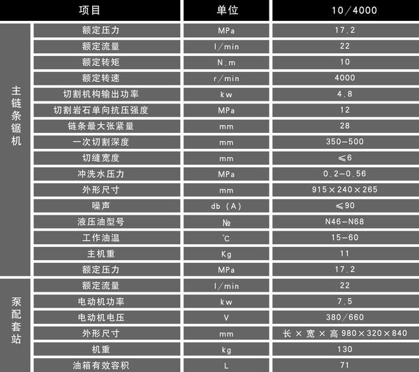 用途 TC-10/4000型隔爆多功能液壓鏈條鋸,是以液壓油為動力、以帶有金剛石刀頭的鋸鏈為切割載體,Z高轉速達5000r/min,一次切割深度達350mm-500mm。廣泛應用于工程和礦山巖石硬度≤12MPa的各種軟硬巖切割和半煤巖巷道的淺孔輔助開槽工作,該鋸另配備硬質合金鋸鏈和伐木鋸鏈,可實現煤層和木材的調整切割。