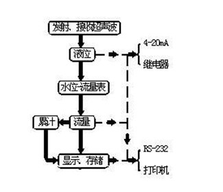 儀表控制探頭發射和接收聲波。按下圖的過程轉為液位(單位:米)。再通過查水位-流量表,把液位轉成流量(單位可以是:升/秒,或立方米/小時)。